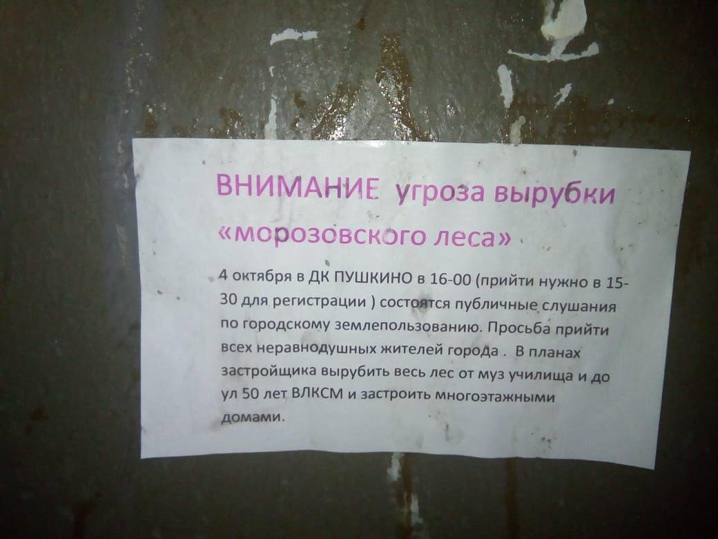 На публичных слушаниях 4 октября в ДК «Пушкино», посвященных обсуждению правил застройки и землепользования на территории Пушкинского городского округа, в ответ на просьбу жителей не рубить этот кусочек сосновой рощи организаторы слушаний сообщили: «…в Морозовском лесу все, что можно, и так уже вырублено, это было сделано в июле-августе текущего года ФБУ ВНИИЛМ…». Эта информация шокировала сотрудников института. Комментарий пресс-службы ВНИИЛМ